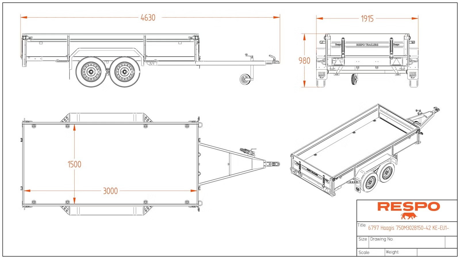 Mit einer Innenfläche von 3,00 × 1,50 m, einem zulässigen Gesamtgewicht von 750 kg, einem Leergewicht von 352 kg und einer Nutzlast von 398 kg bietet dieser Anhänger eine gute Kombination aus kompakter Bauweise und praktischer Nutzbarkeit. Die robuste Konstruktion sorgt dafür, dass der Anhänger auch bei regelmäßiger Nutzung zuverlässig bleibt.