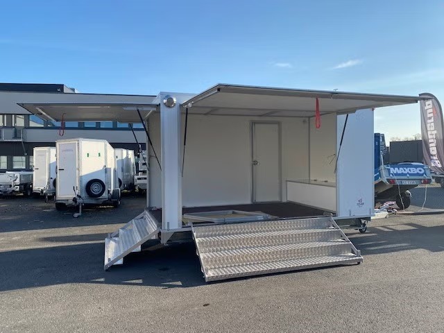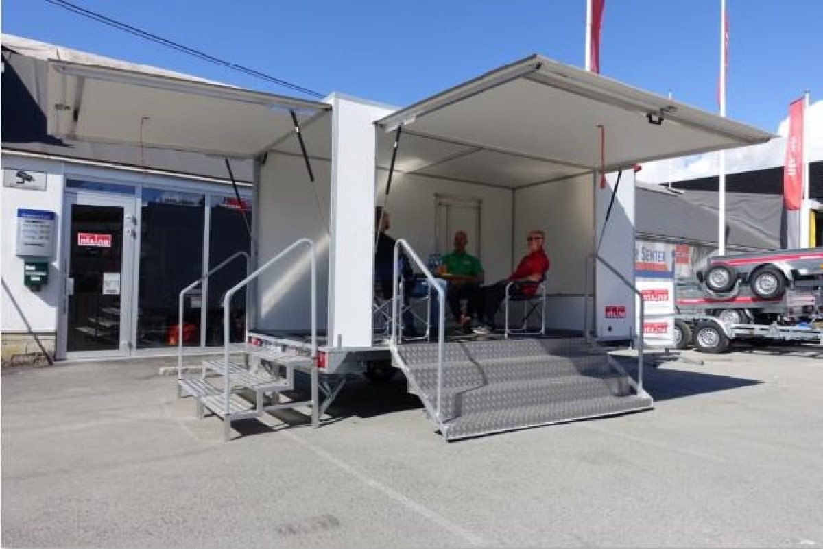 Dieses Modell ist hier als Messeanhänger ausgeführt und verfügt über zahlreiche praktische Details: eine seitliche Klappe oben angeschlagen, eine hintere Klappe oben angeschlagen, eine kleine Seitentür, klappbare Aluminiumtreppen an Seite und Heck, einen Staukasten bzw. eine Sitzbank im Frontbereich, Stützbeine an allen vier Ecken, ein klappbares mittiges Stützrad sowie einen Solarventilator mit Lüftungsklappe. Die Innenbeleuchtung wird über 230 V betrieben, zusätzlich befindet sich außen eine 230-V-Steckdose mit Innenanschluss an der Frontwand.